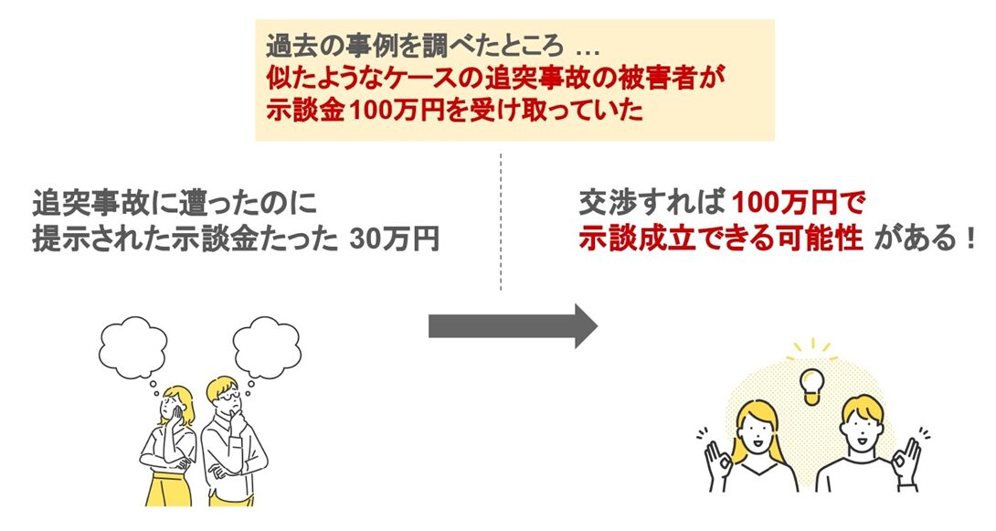 これにより、事故の状況や怪我の程度が近い被害者がどれくらいの示談金を受け取っているか、理解できます。