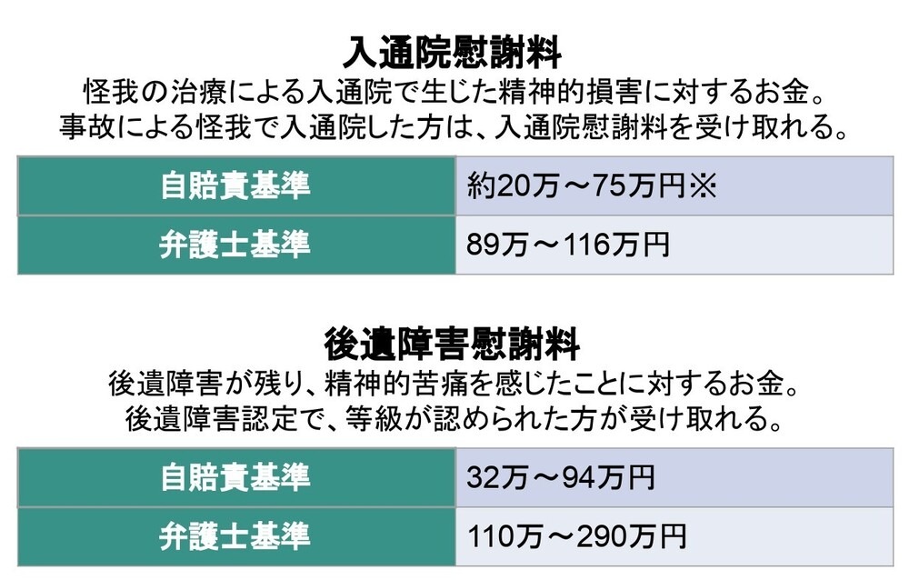| 後遺障害慰謝料:32万円~290万円 事故による後遺症が残り、精神的苦痛を感じたことに対して支払われるお金。 |