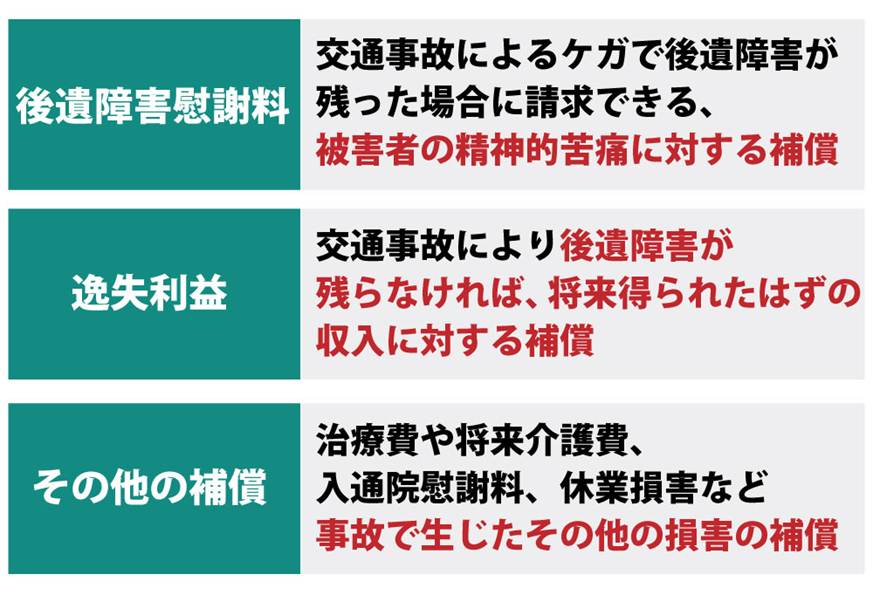 交通事故では、後遺障害に対する補償以外にもさまざまな賠償金を請求することができます。
